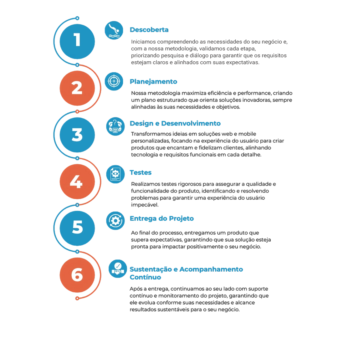 Utilizamos metodologias ágeis, que permitem ajustes rápidos e flexíveis ao longo do desenvolvimento, sem comprometer o prazo ou a qualidade do produto final.